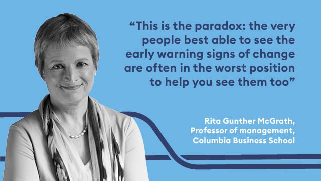 Listen for weak signals to avert potential disasters, urges Columbia Business School professor, Rita Gunther McGrath.