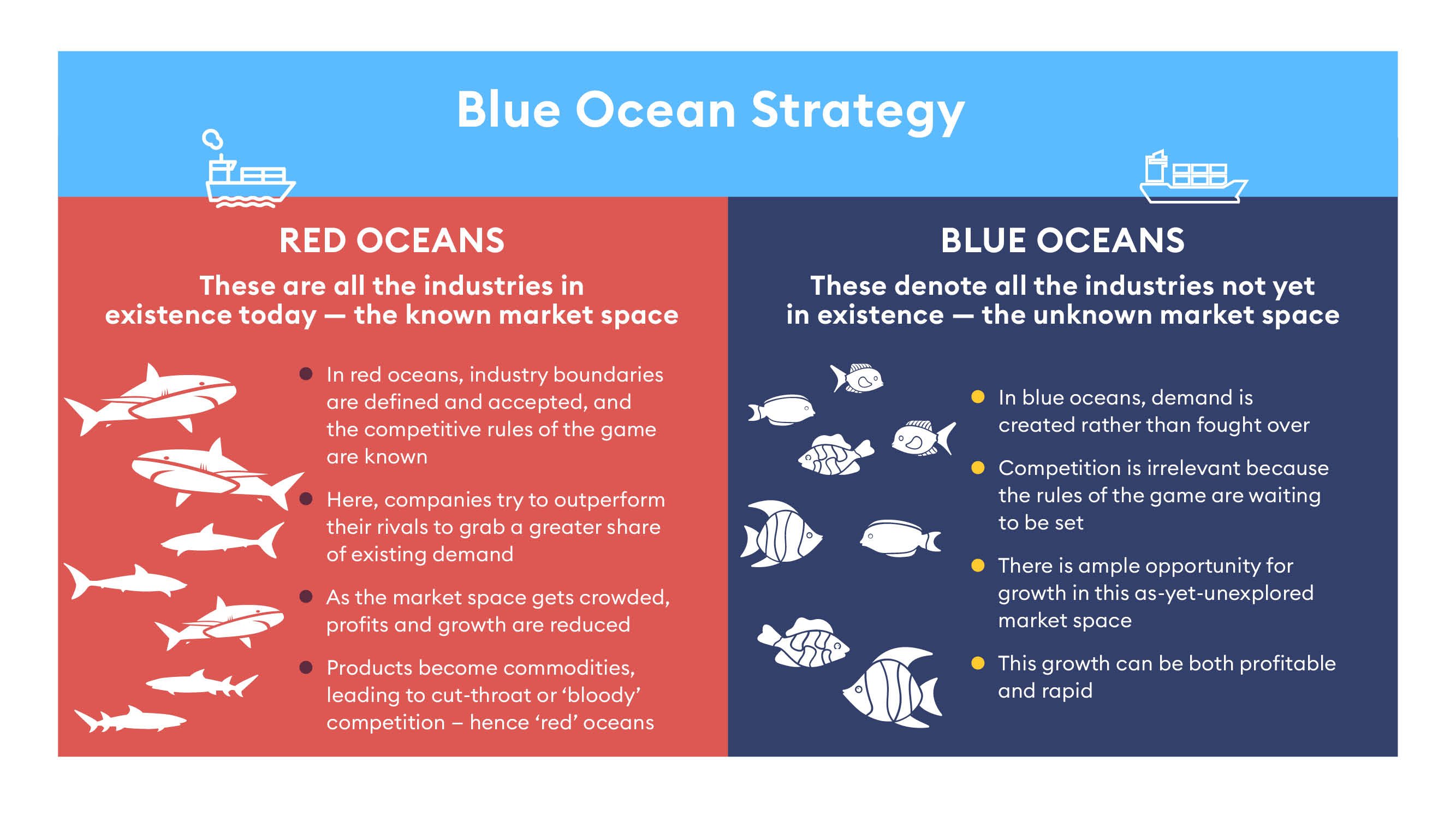 Blue Ocean Strategy was first described by Chan Kim and Renée Mauborgne, who coined the terms ‘red ocean’ (to describe the bloody pool of shrinking profit being fought over by many competitors) and ‘blue ocean’ (to describe the clear waters of opportunity, where new businesses might flourish uncontested).