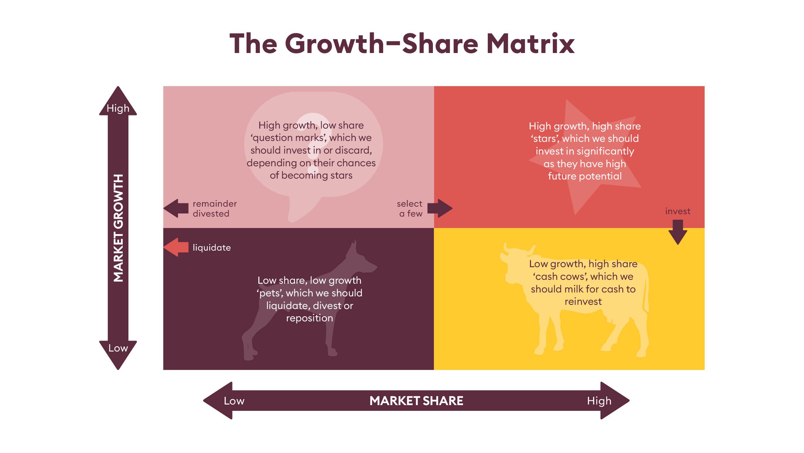 At the core of the matrix is a table, split into four quadrants, each representing a specific combination of relative market share and growth. By assigning each of our businesses to one of these four categories, we can decide where to focus our resources and capital to generate the most value – as well as where to cut our losses.