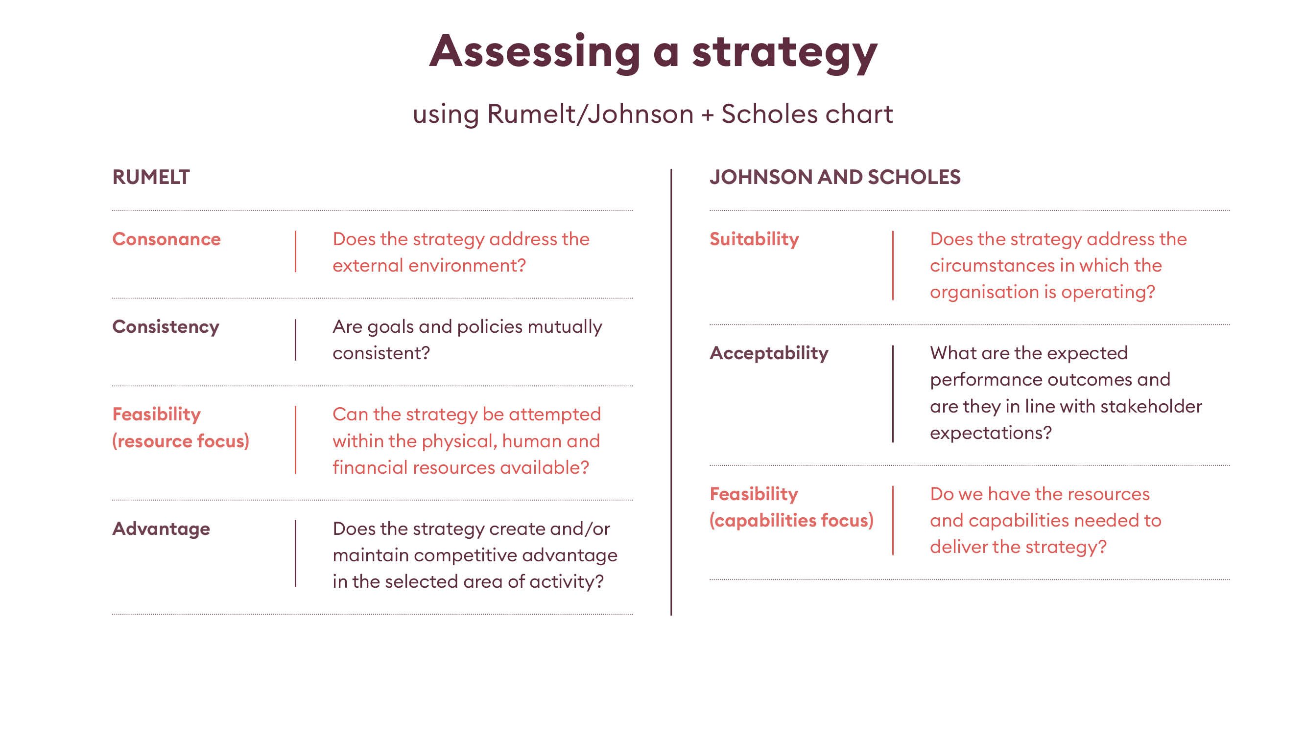 The esteemed strategist Richard Rumelt sets out four tests of strategic options, while Professors Gerry Johnson and Kevan Scholes describe three similar tests.
