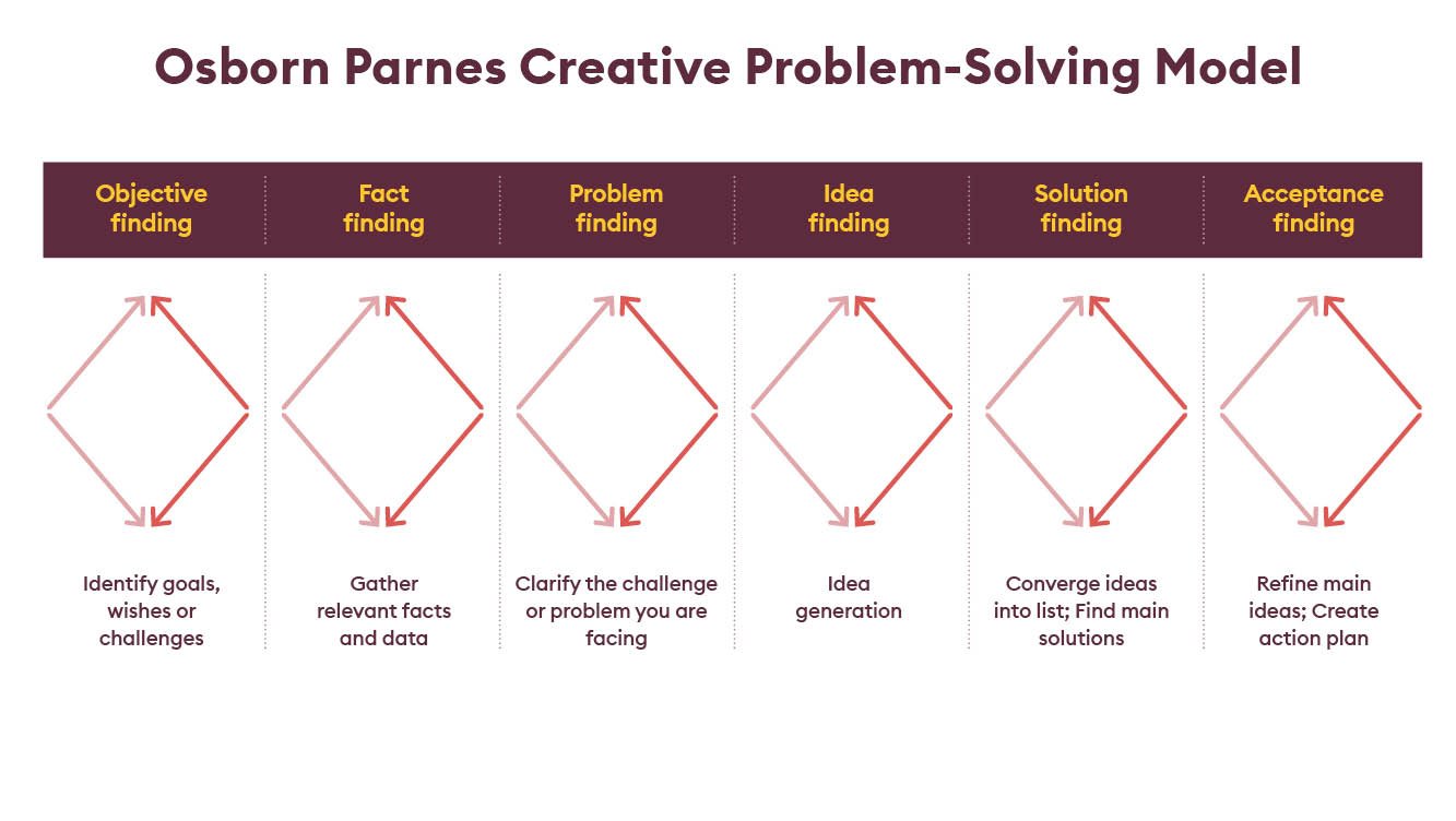 Guiding us to achieve all this in a structured way is the Osborn Parnes creative problem-solving model, developed in the 1950s by Alex Osborn – an American advertising executive, considered to be ‘the father of brainstorming’ – and psychologist Sidney Parnes. It sets out a six-stage process, as outlined below.