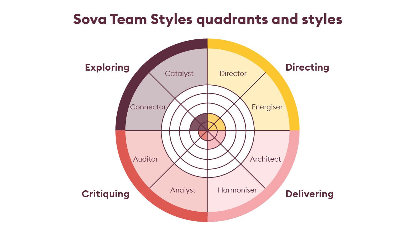 As with DiSC and Social Styles, the Sova Model helps us to identify personal behavioural style preferences and approaches when working collaboratively. The model incorporates eight different team styles across four quadrants: