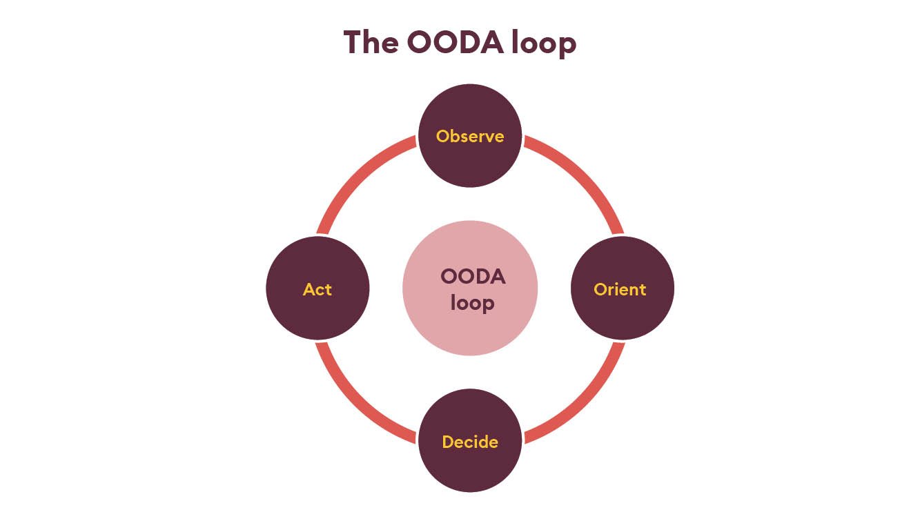 Known as the OODA (Observe, Orient, Decide, Act) loop, it’s a four-step process of decision-making that focuses on filtering available information, putting it in context and quickly making the most appropriate decision - while also understanding that changes can be made as more data becomes available. The process is intended to be repeated, as we gather more information each time; hence the loop.