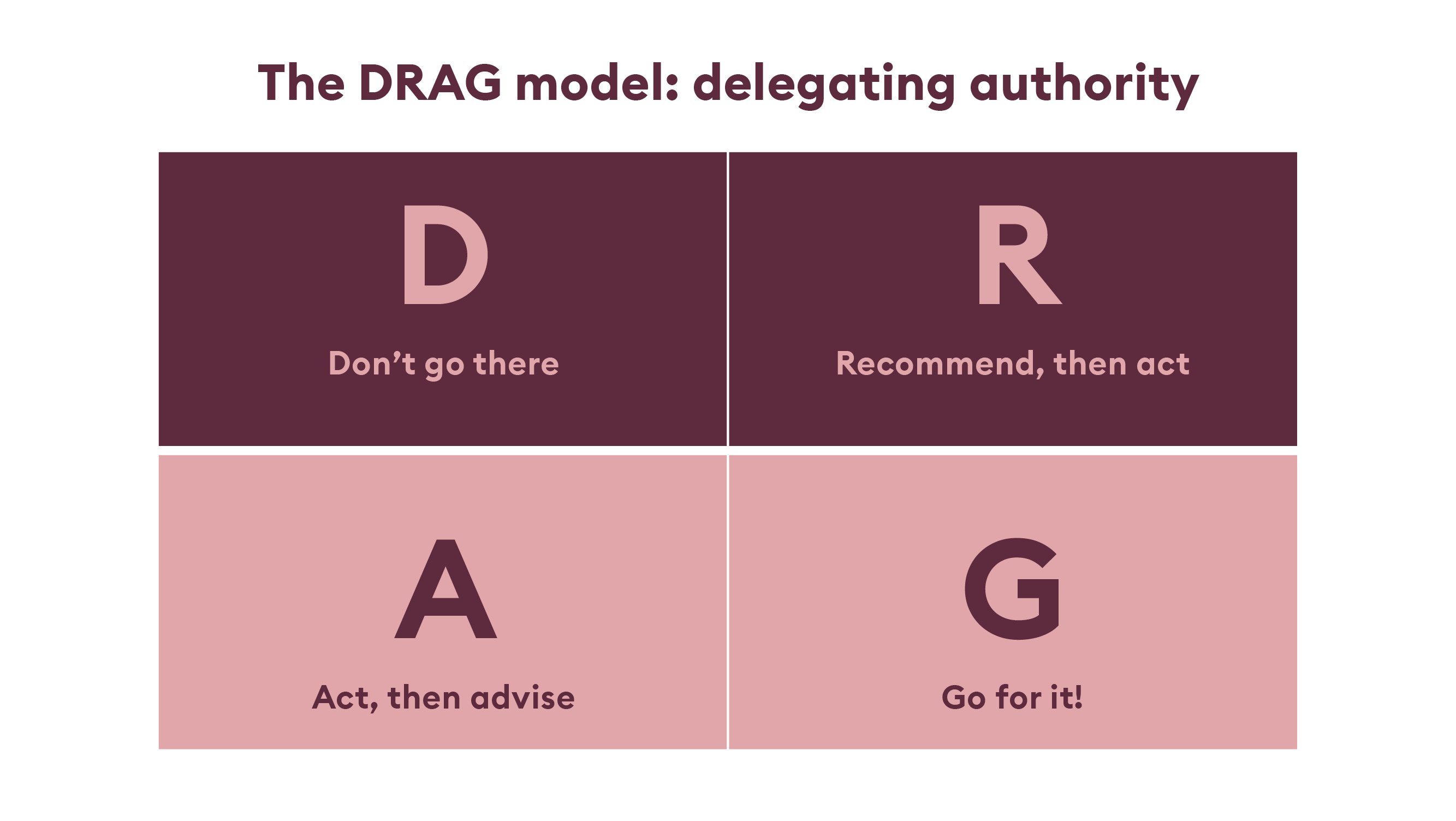 The simple DRAG model can help leaders to be clear about the levels of authority team members can deploy for various tasks. It also helps leaders with their comfort levels around letting go, and to hold the line where they need to keep hold of tasks for themselves; for example, something that might involve confidential information.