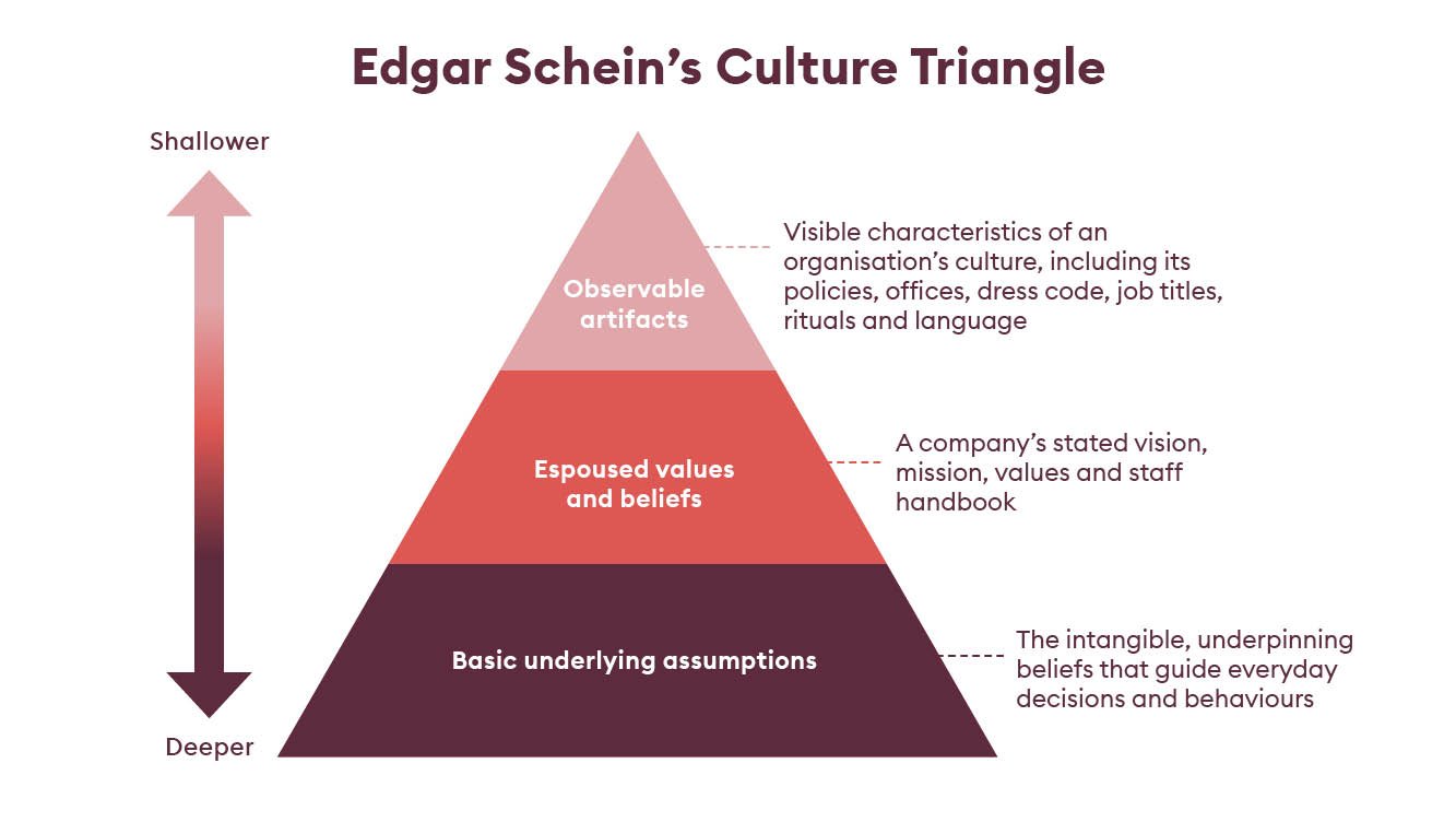 Buy-in from the majority is non-negotiable. “There is no culture unless the group owns it,” asserts former MIT professor Edgar Schein, whose research in this field underpins much of today’s thinking. His three-level model depicts the essence of culture as lying not in an organisation’s ‘observable artifacts’ (such as its policies, offices, dress code or rituals) nor in its stated mission and values, but in its ‘basic underlying assumptions’: those intangible beliefs that guide everyday decisions and behaviours. Without addressing these, we will only change things at a superficial level.