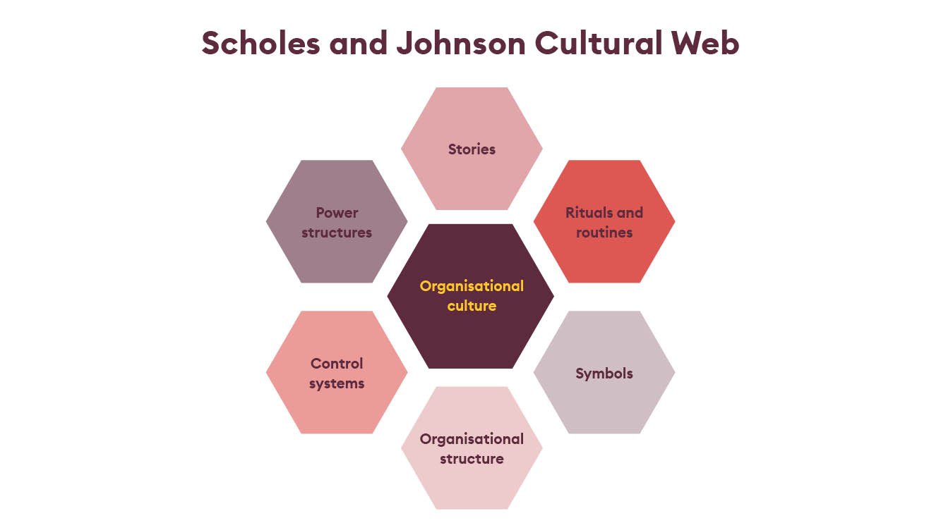 Known as the Cultural Web, this describes the ‘paradigm’ (or lived reality) of an organisation, using six interlinked elements which together create an overall picture: